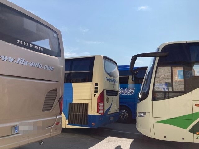 写真はタリンのターミナル近くにある酒類専売店の駐車場の一角。私らのバスも含め、フィンランドの観光バスがいっぱい止まっていました。フィンランドでは酒類が高価なので、エストニアに行って買いだめするフィンランド人が多いのです。行きはがらがらだったうちらのバスのトランクルームも、帰りはなんやかんやと沢山の酒類でいっぱいでしたよ。
